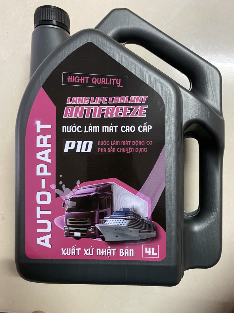 Nước làm mát xe tải và tàu biển Auto-part p10 được pha chế từ gốc ethynene glycol , phụ gia và nước DI có tác dụng trong việc bảO vệ động cơ chống ăn mòn, chống rỉ sét, không chứa chất Nitrite, borate,silicate hạn chế bốc hơi phù hợp cho động cơ, ô tô, xe tải, tàu thuyền, ..